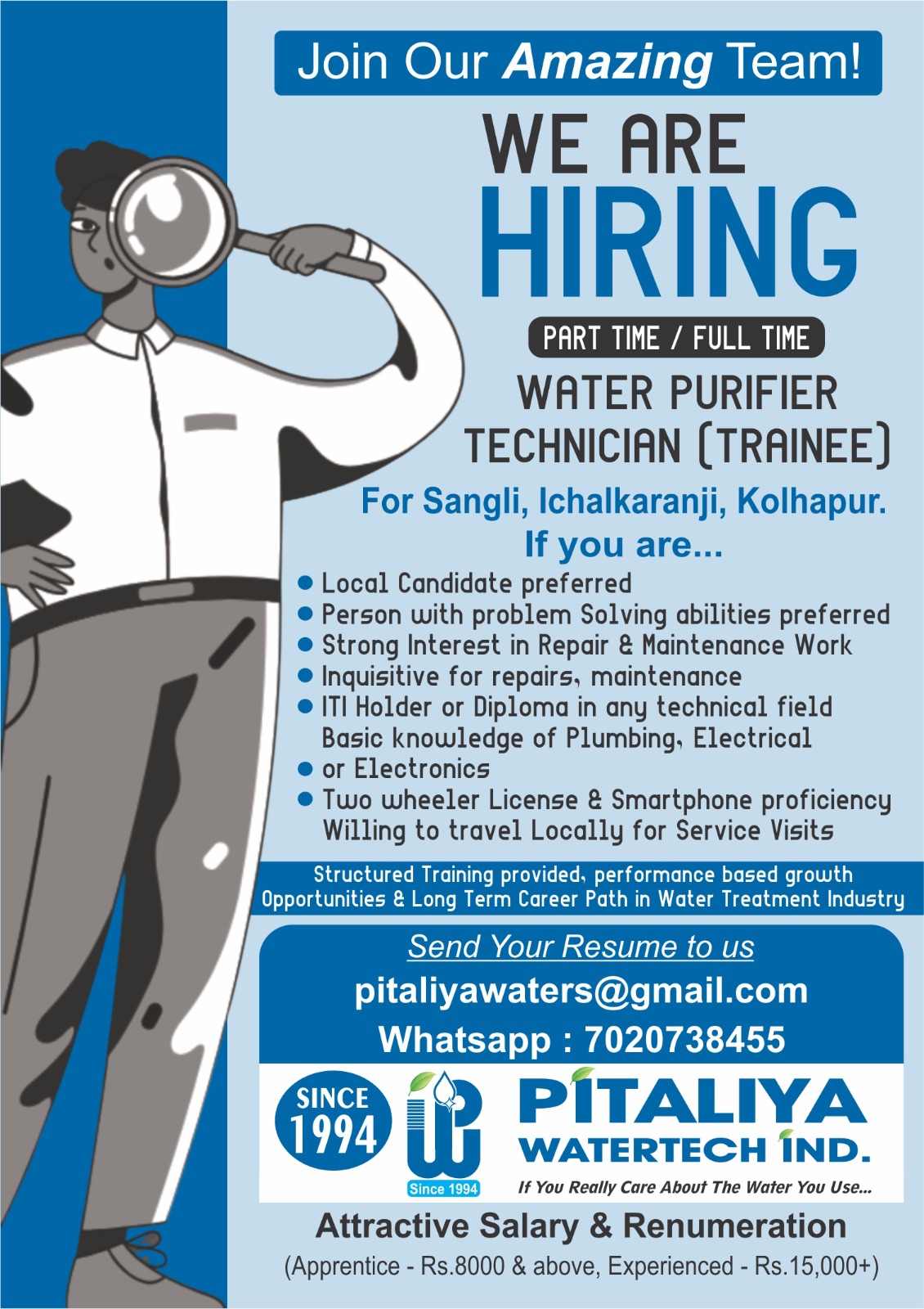 We are an established water treatment company seeking a skilled and responsible Service Technician for installation, maintenance and troubleshooting of RO Water Purifiers, Commercial RO Plants, Water ATM systems and Water Softeners.